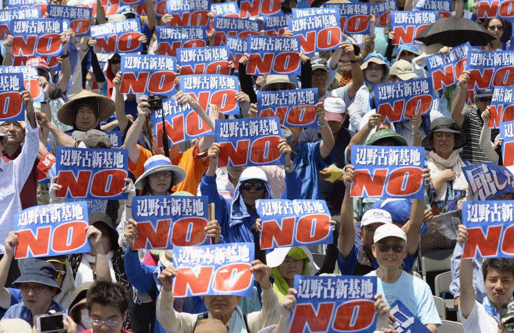 Peu de progrès a cependant été fait depuis pour implémenter cet accord, et la frustration des habitants d’Okinawa a continué de croître. La province est maintenant en révolte ouverte contre le gouvernement central. Le gouverneur ainsi que la quasi-totalité des autres élus locaux sont opposés au projet de relocation de Futenma (ils demandent la fermeture pure et simple de la base), qui a été bloqué sur le terrain par des activistes très déterminés. Tous demandent que le nombre total de troupes à Okinawa soit fortement réduit et que les crimes commis par des soldats américains soient traités au Japon par le système de justice japonais. Un nouvel incident de viol et de meurtre d’une jeune japonaise par un ressortissant américain en mai de cette année n’a fait que renforcer leur détermination.