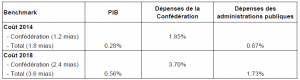 Mais qu’en est-il par rapport aux dépenses publiques, lesquelles sont modérées en Suisse par rapport aux autres pays ? Même sur cette base, le coût reste modeste. Plus précisément, les frais à charge de la Confédération (seconde colonne) représenteront 3.7 pourcent des dépenses fédérales en 2018. Le coût total incluant les Cantons quant à lui ne représentera que 1.73 pourcent des dépenses de l’ensemble des administrations publiques (Confédération, Cantons, Communes, Assurances sociales). Bien entendu ceci n’est pas « rien », mais nous sommes loin de montants insupportables.