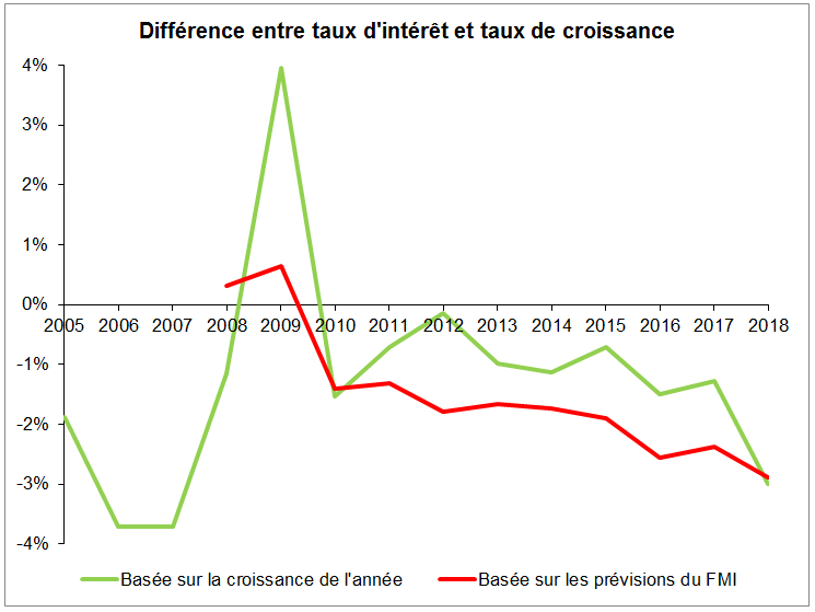 Dans une étude publiée aujourd’hui, intitulée Le « fardeau » de la dette publique suisse : Eclairages des recherches scientifiques et pistes pour le futur, j’examine les récents travaux scientifiques sur la dette publique et applique leurs implications à la Suisse. La dette de la Confédération est à un niveau faible (moins de 15 percent du PIB), elle a nettement diminué depuis 2008, et les projections montrent une baisse supplémentaire dans les années à venir (première figure ci-dessous). Dans le même temps les taux d’intérêt sont clairement à la baisse, même pour de longues maturités (seconde figure). Actuellement le rendement d’un placement à 10 ans auprès de la Confédération est de -0.7 pourcent par année.
