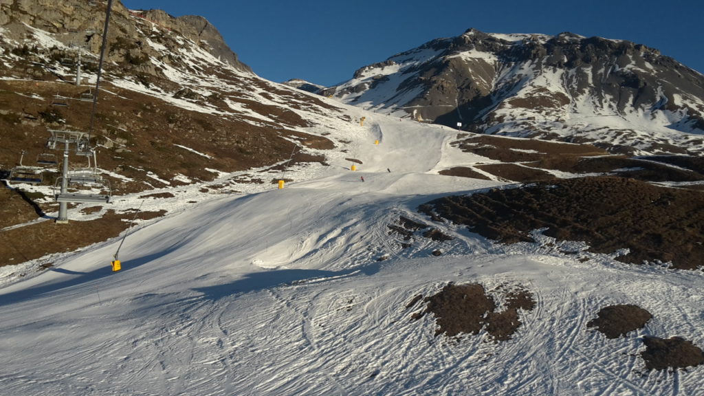 Jusqu’à présent, la principale réponse au changement climatique a été l’utilisation de l’enneigement artificiel. 53% des pistes en Suisse en sont aujourd’hui équipées (chiffres des Remontées mécaniques suisses) mais un peu moins en Valais (40% selon une enquête du Walliser Bote parue le 6 février dernier). La proportion d’équipement varie considérablement d’un domaine skiable à l’autre, certains en ayant peu ou pas du tout, tandis que d’autres ont une couverture supérieure à 80% (comme les 4 Vallées et Zermatt). Et c’est toujours la réponse qui continue à être privilégiée: toujours selon le même article, les entreprises valaisannes entendent investir plus de 50 millions dans les canons à neige ces cinq prochaines années. L’objectif est de pouvoir assurer au moins 100 jours d’exploitation du domaine skiable, seuil considéré comme nécessaire pour pouvoir faire tourner économiquement un domaine skiable.