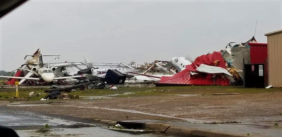Au début: photo de l’aéroport de Monroe, Louisiane, Etats-Unis après le passage de la tornade en avril 2020: Cloë Ishee, Facebook