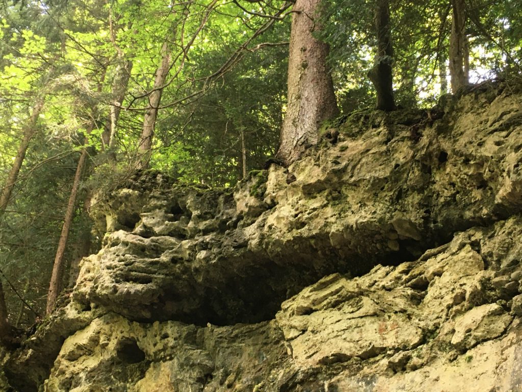La première photo montre un arbre qui pousse sur un rocher, la deuxième, des racines d’arbres qui forment un réseau sur le rocher, atteignent le sol en dessous, et maintiennent le rocher en place.