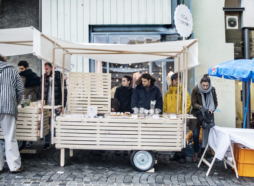 Le travail se poursuit avec la conception des stands du marché lors d'un workshop dirigé par Adrien Rovero en partenariat avec les étudiants du Master Espaces et Communication de la HEAD à Genève.