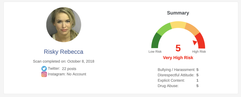 Toujours grâce une «intelligence artificielle avancée», chaque rapport adressé aux parents comprendra aussi une évaluation des personnalités à risque – drogué, harceleur ou violent – Illustrée par une jauge de type indicateur de vitesse. L’échelle de valeurs va du 1 «non risqué» au 5 «très risqué». En guise d’exemple, la note 5 est attribuée à une jeune femme blonde appelée Risky Rebecca – bien que son prénom aurait déjà pu leur mettre la puce à l’oreille.