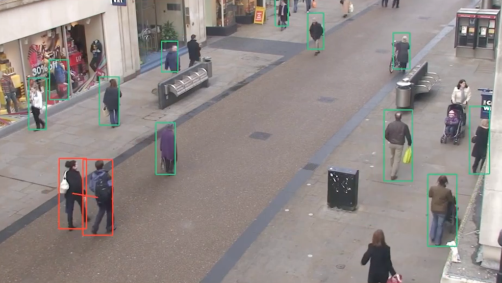 En plus sophistiquée, la société Landing AI, a développé un logiciel doté d’intelligence artificielle qui s’intègre dans un système de vidéosurveillance existant, capable de mesurer la distance sociale entre deux personnes en temps réel. On voit sur la vidéo, des cadres en surimpression verts et rouges, contournant des personnes en mouvement. Selon MIT Technologie Review, Amazon utilise également un logiciel similaire pour surveiller le degré de séparation entre les employés de ses entrepôts.