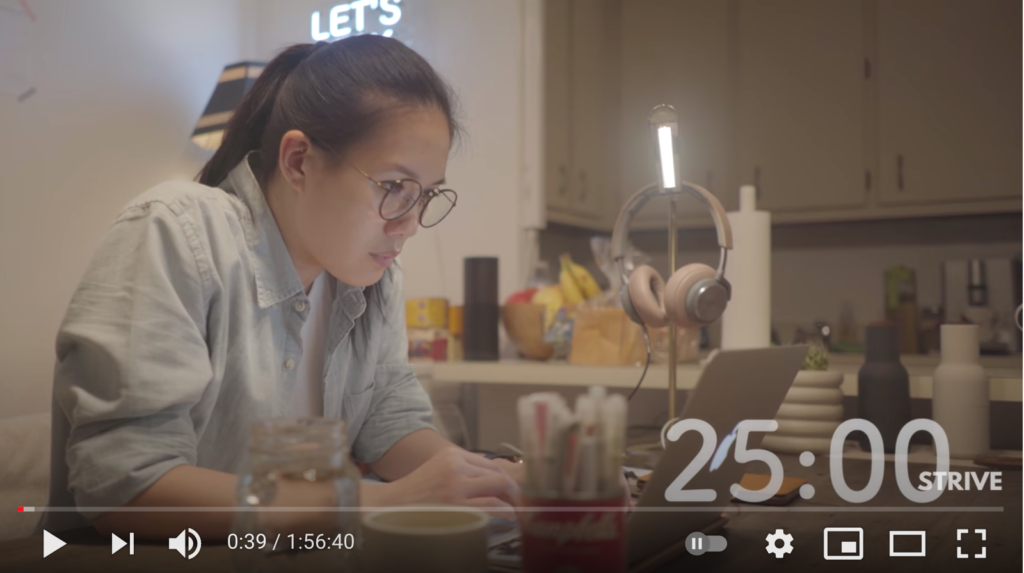 Une chaîne populaire appelée The Strive Studies a été lancée par une résidente en médecine à New York nommée Jamie. Dans une des sessions, après avoir écrit bonjour à tous, elle préconise d’appliquer la méthode Pomodoro – dont le principe est de rester concentré à 100% sur une seule et unique tâche pendant 25 minutes avant de faire un break. On la voit en gros plan, assise dans sa cuisine devant son ordinateur pendant 2 heures. Cette séquence a été vue plus de 1.4 million de fois.