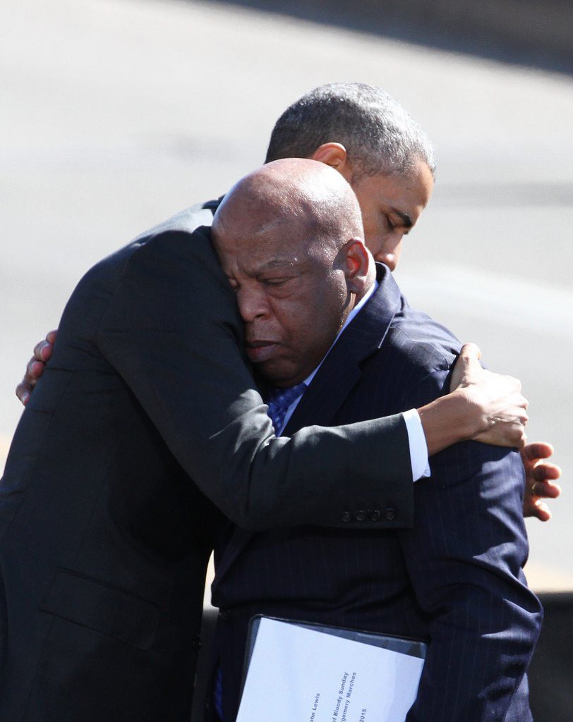 Samedi, la présence du premier président noir des Etats-Unis fut très symbolique. Une image restera dans les mémoires: l’embrassade très émotionnelle de Barack Obama et de John Lewis, un représentant noir de Géorgie qui fut sévèrement battu par la police sur le pont Edmund Pettus le 7 mars 1965.