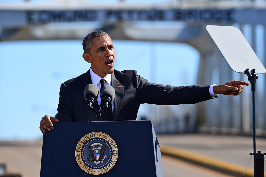 President Barack Obama speaks near the Edmund Pettus Bridge, Saturday, March 7, 2015, in Selma, Ala. This weekend marks the 50th anniversary of “Bloody Sunday,’ a civil rights march in which protestors were beaten, trampled and tear-gassed by police at the Edmund Pettus Bridge, in Selma. (AP Photo/Bill Frakes)