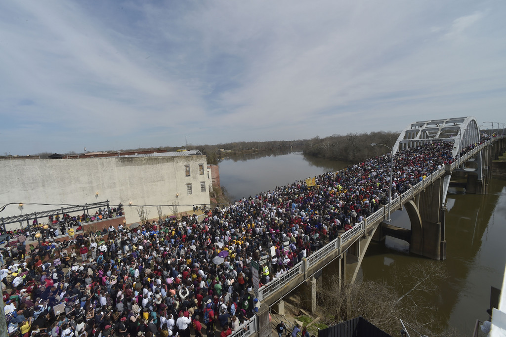 Crowds of people take a symbolic walk across the Edmund Pettus Bridge, Sunday, March 8, 2015, in Selma, Ala. This weekend marks the 50th anniversary of “Bloody Sunday,’ a civil rights march in which protestors were beaten, trampled and tear-gassed by police at the Edmund Pettus Bridge, in Selma. (AP Photo/Bill Frakes)