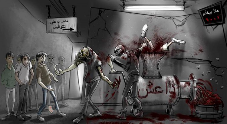Le 16 mars dernier, un avion de chasse F-15 américain a largué près de 60 000 tracts de propagande en Syrie, notamment au-dessus de la ville de Raqqa, bastion des djihadistes de l’Etat islamique. Comme le raconte le dessinateur Michael Cavna, (auteur de la bande dessinée Riffs”), le dépliant montre deux militants de l’Etat islamique en train de recruter de nouveaux combattants. Ces derniers passent toutefois directement dans une vaste machine, un moulin à viande pour être transformés en produits de boucherie.