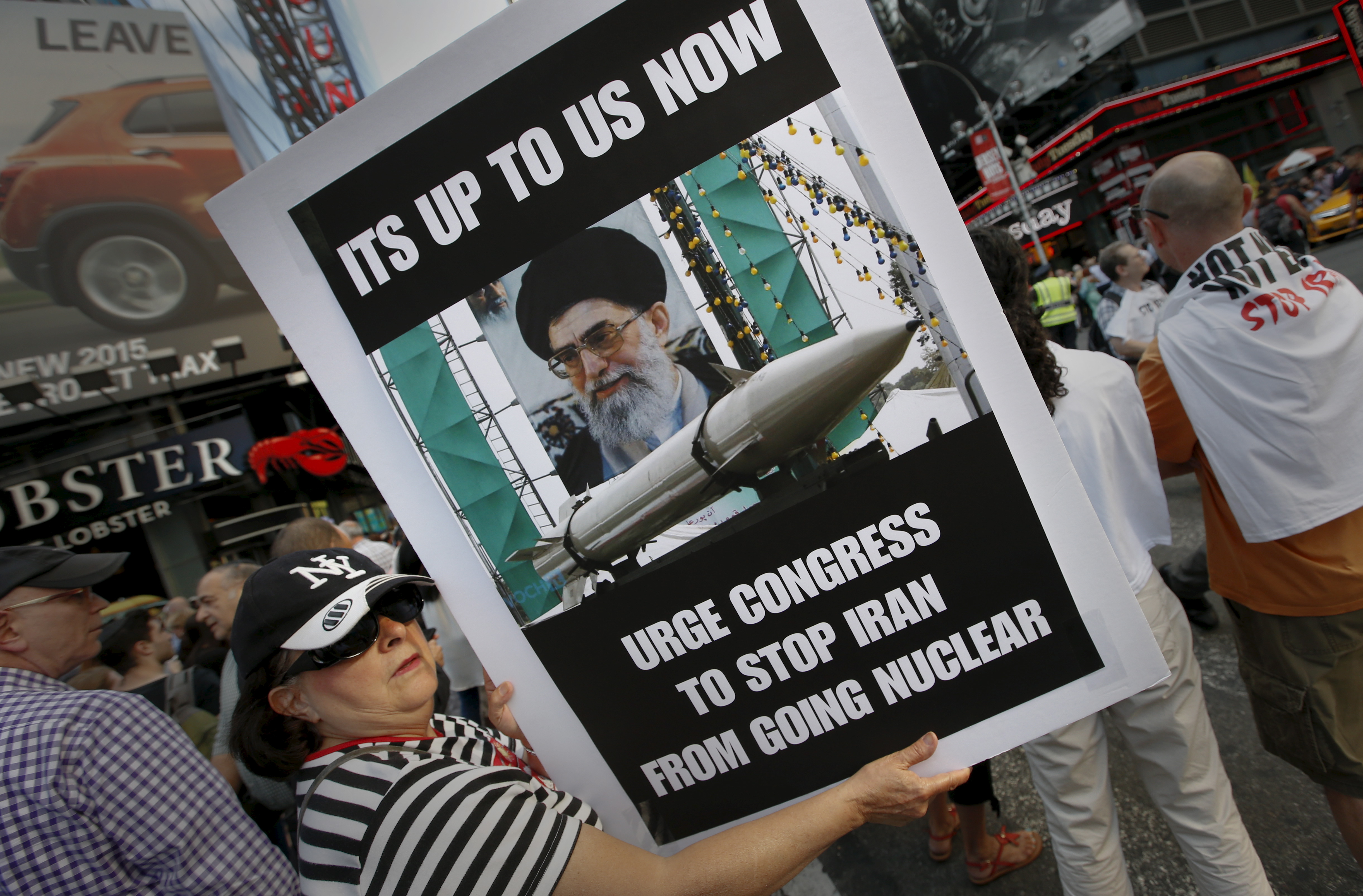 A woman holds a placard as she joins several thousand other protestors to demonstrate during a rally apposing the nuclear deal with Iran in Times Square in the Manhattan borough of New York 23 juillet 201523 juillet 2015 Stéphane Bussard Précédent Suivant Une opposante à l’accord sur le nucléaire iranien à Times Square, Manhattan, REUTERS/Mike Segar