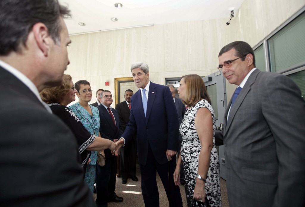Jose Ramon Cabanas, au premier plan lors de la réouverture de l'ambassade de Cuba à Washington. Le premier ambassadeur cubain dans le Bureau ovale depuis la rupture des relations diplomatiques en 1961 (AP Photo/Ismael Francisco, Cubadebate)