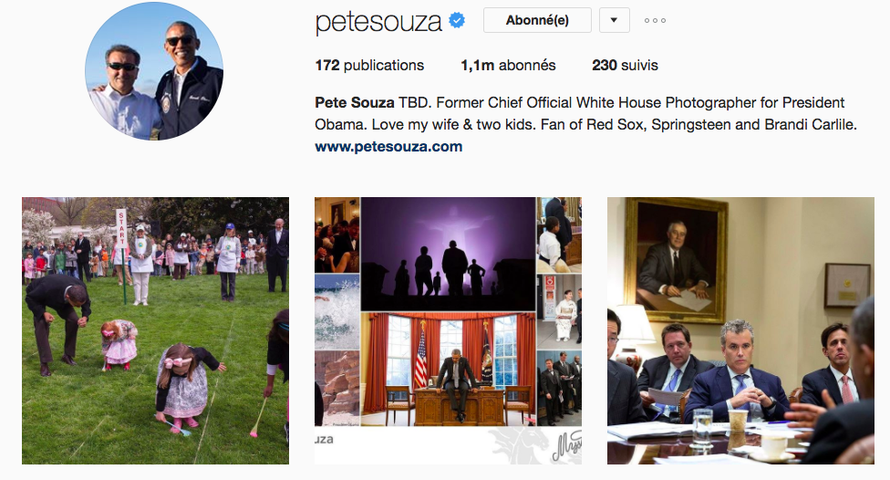 Pete Souza donc, l’homme qui a travaillé pour de prestigieuses publications et qui a notamment couvert la guerre en Afghanistan, est un nostalgique de l’ère Obama. Il avait capturé des moments-clés de son mandat, mais aussi des instants plus intimistes, nous montrant des facettes plus privées du premier président noir des Etats-Unis et de sa famille. Il prenait entre 500 et 1000 photos par jour. Parfois bien plus. Pour comprendre comment il manifeste son anti-trumpisme, c’est sur son compte Instagram qu’il faut aller. Un compte suivi par plus d’un million d’afficionados.