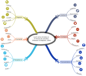 Les forces de caractère de Peterson et Seligman constituent un modèle-phare pour développer les ressources des individus. En partant de six vertus (sagesse, courage, humanité, transcendance, tempérance, justice), les chercheurs ont isolé 24 forces spécifiques : créativité, amour de l’apprentissage, curiosité, perspective, pensée critique, capacité à diriger, sens de la justice, travail d’équipe, prudence, maîtrise de soi, modestie, pardon, spiritualité, humour, gratitude, reconnaissance de la beauté, optimisme, intelligence sociale, gentillesse, capacité d’aimer et d’être aimé, joie de vivre, honnêteté, persévérance, courage.