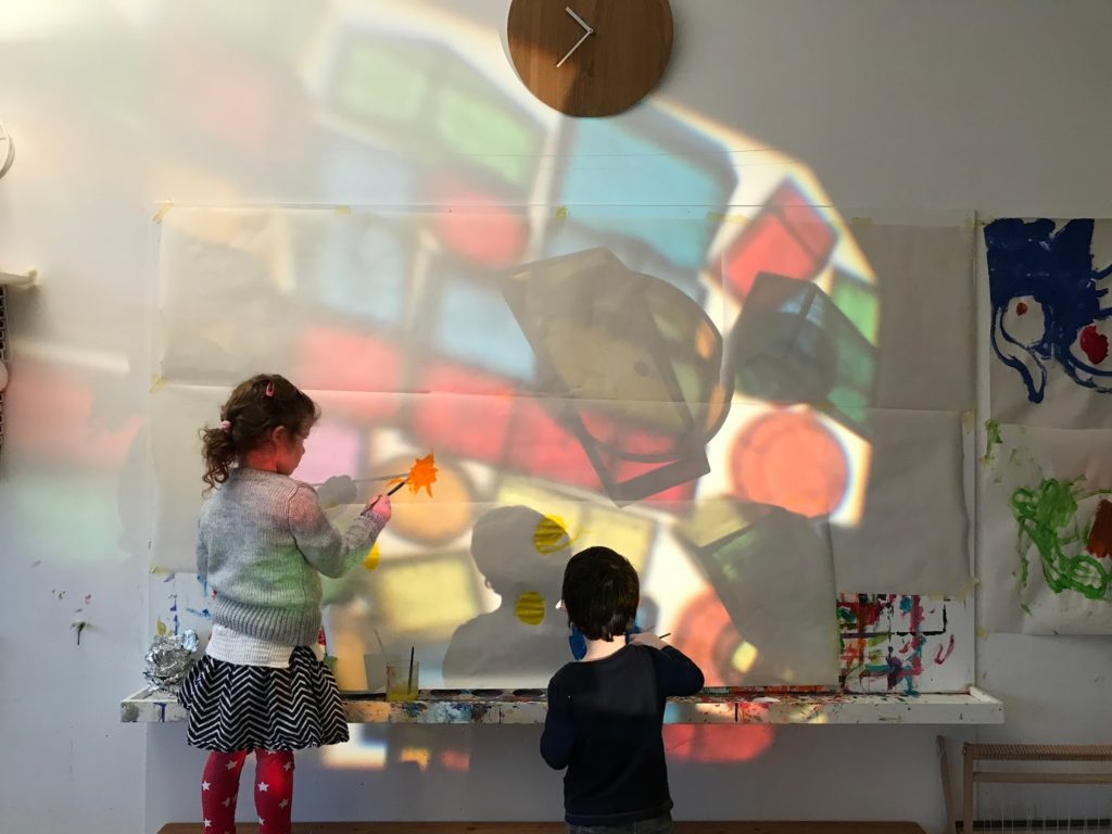 Une fois par semaine, nous avons une artiste (Arts visuels) qui vient passer la matinée dans notre atelier, adjacent à la classe, et propose aux enfants qui le souhaitent de participer à un projet qui évolue souvent sur plusieurs semaines. Souvent ce projet part d’une interprétation de l’artiste d’une thématique apportée par un enfant ou un groupe d’enfant et explorée en classe à travers un autre biais que l’art.