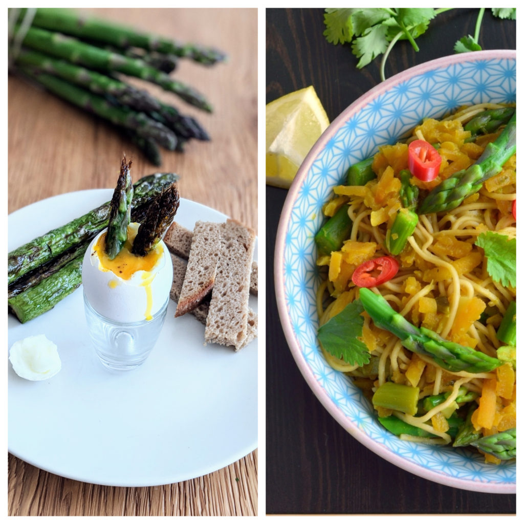 La première est pratique pour le petit déjeuner, brunch, une entrée ou un souper léger. C’est une honte tellement elle est simple: des œufs à la coque avec des asperges en guise de mouillettes. L’autre est un plat de résistance végétarien-compatible pour la paix des familles.