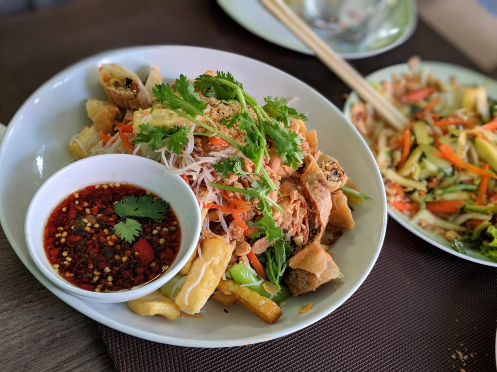J’attrape fébrilement deux baguettes et c’est parti. Les bâtonnets de mangue verte apportent effectivement une saveur acidulée et un agréable croquant sous la dent. Elle est mélangée avec des crevettes, des tout petits bâtonnets de carottes bien souples ayant mariné dans un je-ne-sais-quoi légèrement douceâtre et acidulé. (Je n’en saurai pas plus, c’est le secret d’Anna). L’ensemble est accompagné de feuilles de salade, de menthe, de coriandre et, je crois, de basilic thaï. Un petit tapis de cacahuètes et d’oignons frits croustillants parsème le tout, qui repose dans une sauce subtile, légère, dans laquelle je crois déceler de la sauce nuoc-mam et un peu de sucre. «C’est sans matière grasse» me dit-on. Mais surtout, c’est bon et d’une absolue fraîcheur. Piquant, sucré, salé et autres réjouissances tournent, vont et viennent, sans que jamais cette mécanique ne se grippe. Un manège de saveurs magistralement orchestré.