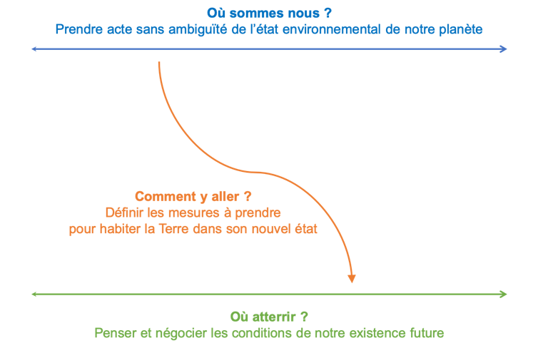 Comment, dans ces conditions, inventer le courant éducatif qui succédera à l’éducation au développement durable ? Pour y réfléchir, nous nous inspirons des travaux de Bruno Latour et proposons une grille d’analyse susceptible de clarifier quelque peu les pistes à suivre dans la perspective du « grand basculement » évoqué plus haut. Elle consiste à distinguer les trois questions : où sommes-nous ? Où voulons-nous aller (Bruno Latour dirait « Où atterrir ? ») ? Comment pourrions-nous y aller ? Des questions qui reviennent respectivement à prendre acte sans ambiguïté de l’état environnemental de notre planète, à penser et négocier les conditions de notre existence future, ainsi qu’à définir les mesures à prendre pour habiter la Terre dans son nouvel état.