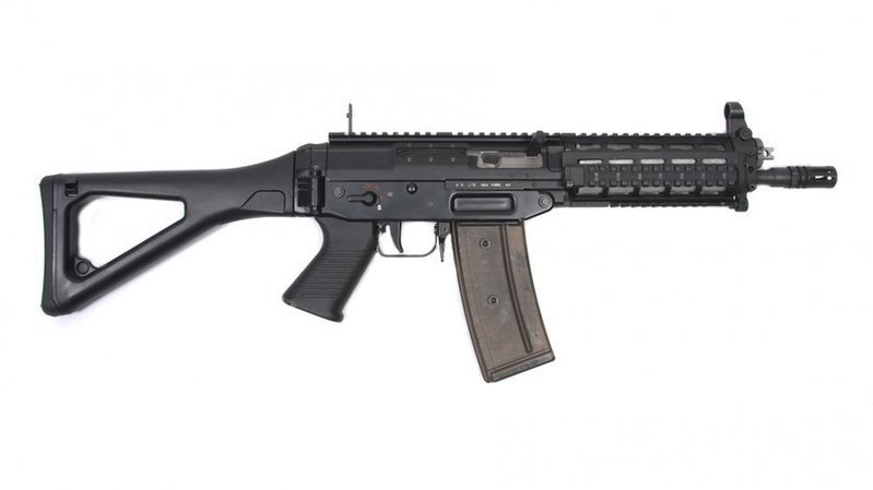 (Photo : fusil d’assaut court facile à la manipulation, tire au coup par coup, se range dans les coffres des véhicules de police et dispose d’un système d’aide à la visée.)