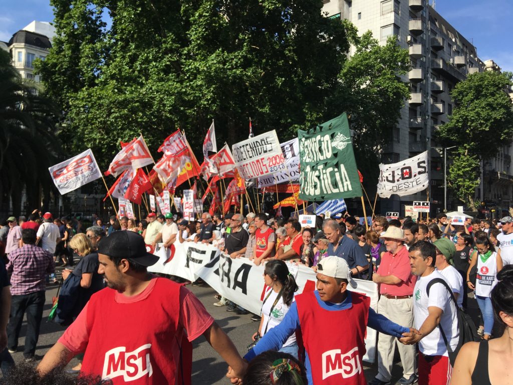 L’évènement avait lieu dans le cadre de la semaine d’action contre le G20, organisée par les mouvements sociaux pour protester contre le sommet des chefs d’Etat et de gouvernement qui se tenait dans la capitale argentine – et pour la première fois en Amérique latine. Des ateliers contre le libre-échange et l’extractivisme se sont succédé à l’université et sur la place du Congreso (le parlement argentin), où des citoyens concentrés ont bravé la pluie diluvienne pour refaire le monde sous des bâches en plastique. La mobilisation a culminé dans la manifestation du 30 novembre, où des dizaines de milliers de personnes ont défilé dans les rues de Buenos Aires, scandant des slogans au son de la musique, dans une ambiance militante mais entièrement pacifique. En tête du cortège, une représentante des grand-mères de la Plaza de Mayo, le caractéristique fichu blanc sur la tête, et Perez Esquivel, rescapé de la dictature argentine et lauréat du Prix Nobel de la Paix, opposé aux accords de libre-échange et qui a servi de médiateur entre les autorités, qui craignaient des débordements et voulaient dans un premier temps interdire la manifestation, et les mouvements sociaux