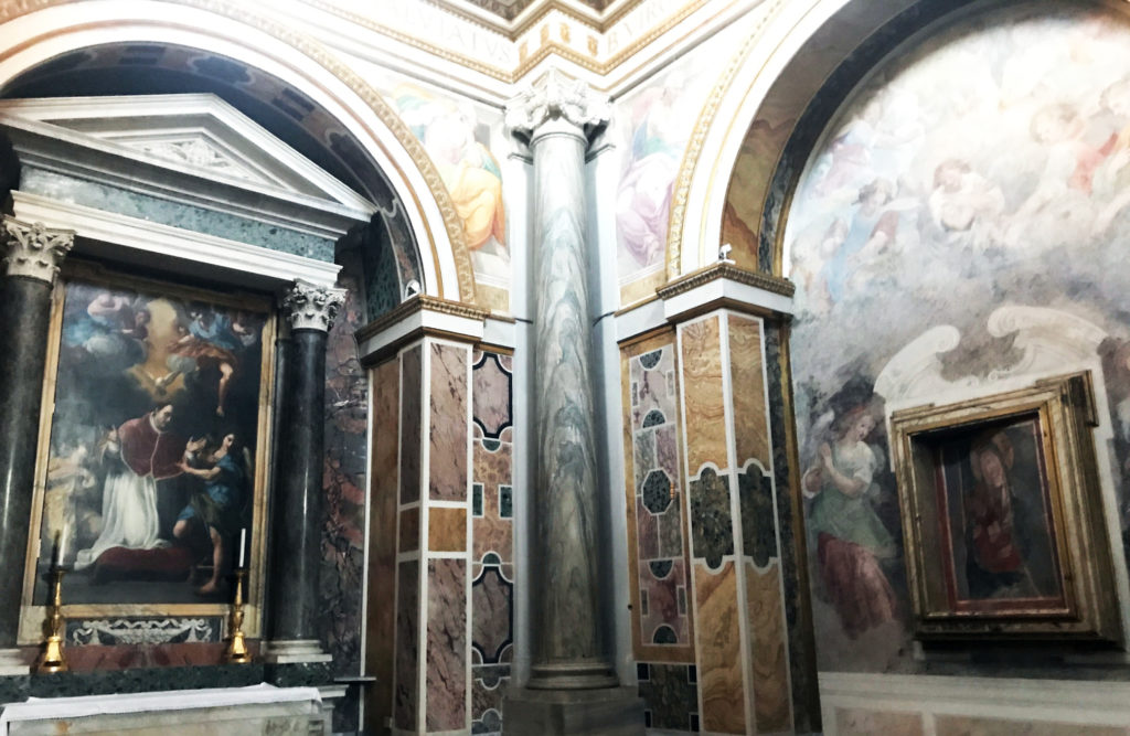 Malheureusement, le tableau aujourd’hui exposé n’est qu’une pâle copie de l’original. Celui-ci a été saisi par les troupes napoléoniennes en 1798 puis arriva plus tard dans la collection Bridgewater à Londres où il fut détruit durant la seconde guerre. Et pourtant, malgré la présence d’une copie, le dispositif imaginé par Carracci et le commanditaire fonctionne toujours. On perçoit alors un véritable dialogue entre une œuvre d’art et une image mariale : les deux protagonistes se regardent, chacun exposé sur deux murs perpendiculaires. Le spectateur se trouvant entre quatre yeux est comme pris à parti dans cet échange. A cela s’ajoutent l’architecture de Carlo Maderno et les fresques de Giovanni Battista Ricci représentant dans la coupole les cieux eschatologiques, le tout fonctionnant sur un effet d’illusion et de cadrage amenant le spectateur à être saisi dans une sorte de « réalité virtuelle » en face de corps surgissant d’un autre temps. Il ne s’agit donc pas seulement de la simple illustration visuelle d’une légende grégorienne mais bien du partage de son expérience vécue, au point que la représentation d’un miracle se fasse miracle de l’art. Car voilà que plus de quatre siècles après la création de la chapelle, l’événement miraculeux fonctionne encore. C’est dans cette performativité toujours réactualisée que la Madone, grâce à son image, non seulement nous regarde dans son absence, mais aussi nous parle dans son silence.