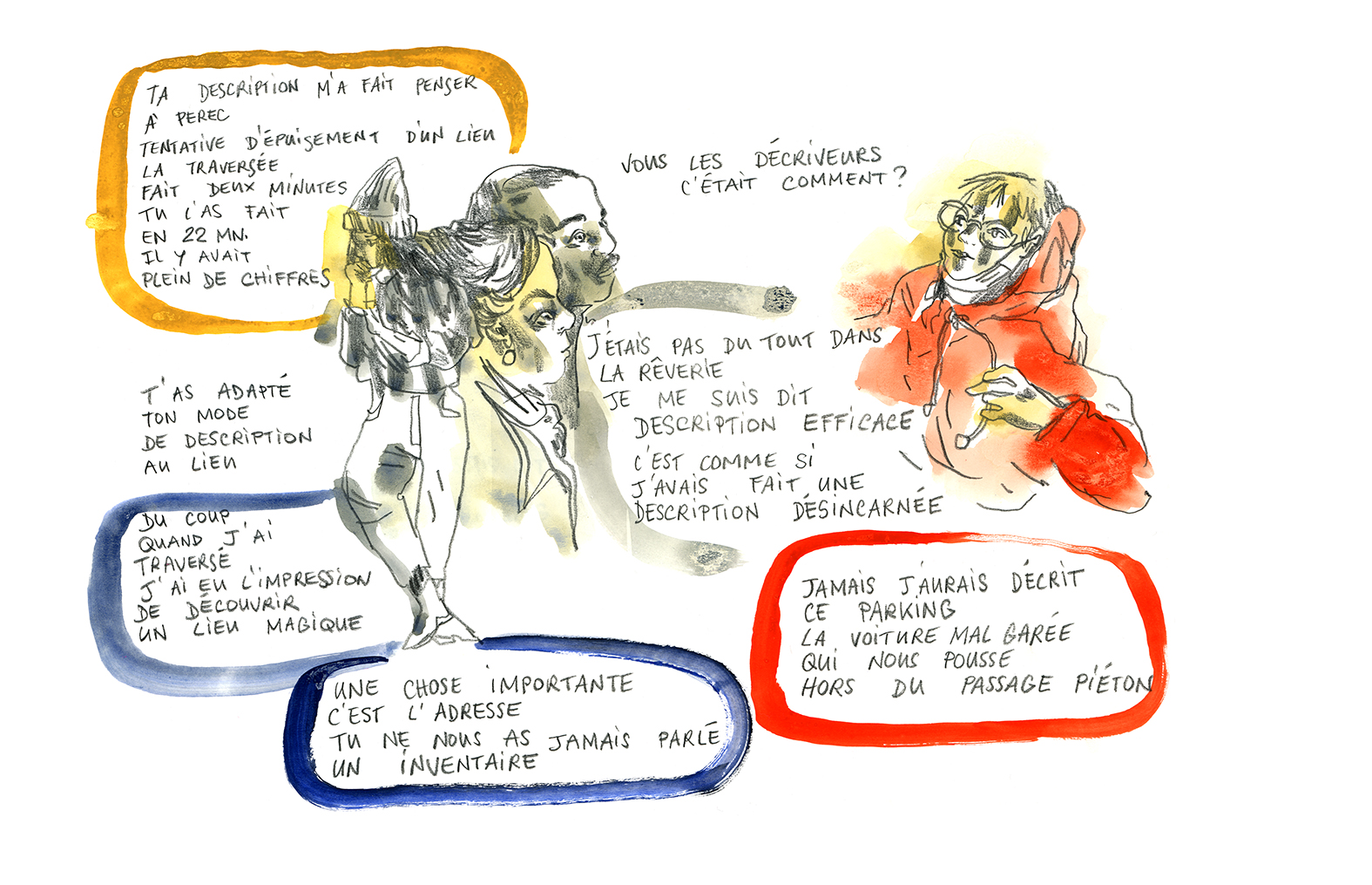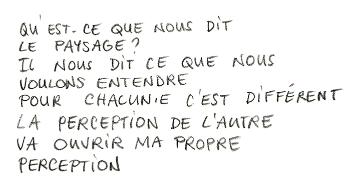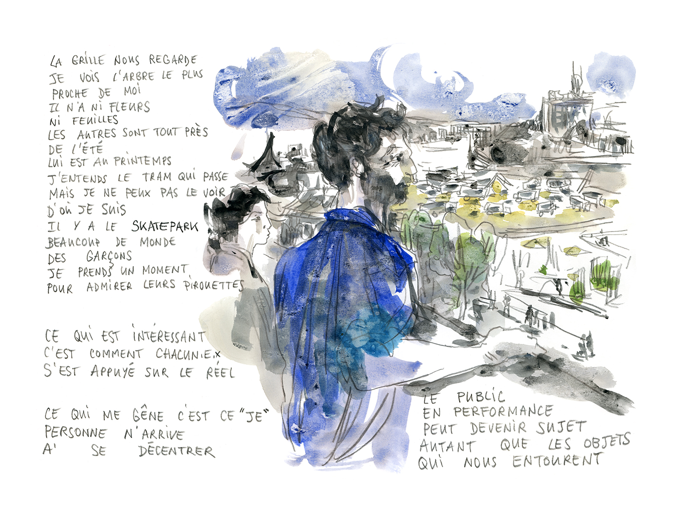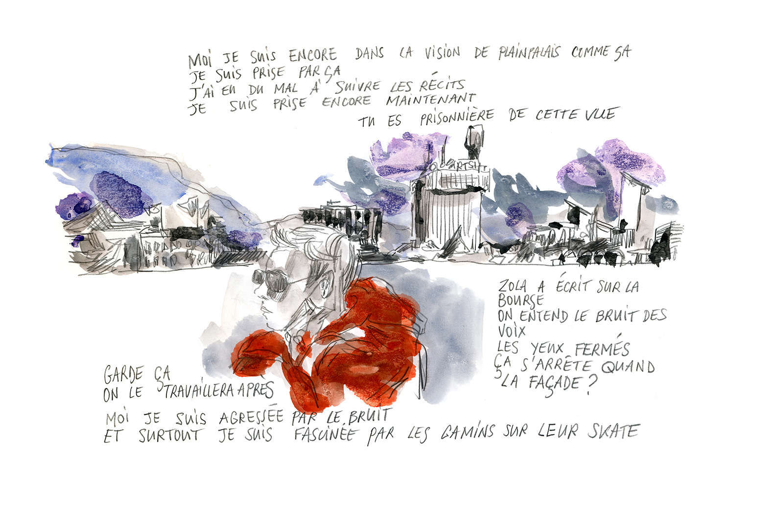 Basé à Genève, le collectif Dénominateurs communs engagent des démarches expérimentales qui placent l’imaginaire collectif, le génie du lieu et l’expérience sensible de l’espace au centre de leur projet artistique. Ils créent des fictions poétiques inspirées par le réel. Leur travail artistique relie art vivant et territoire en imaginant des dispositifs qui mettent en scène la relation du vivant à son milieu. Ce jour-là à Genève, sur la plaine de Plainpalais dans le cadre des ateliers de l’UNIGE, Maria Da Silva, metteure en scène, et Nicolas Dutour, architecte paysagiste HES, menaient le jeu autour de l’étrange familiarité pour trois participant-e-x-s, Annie, Juana et Ilias.