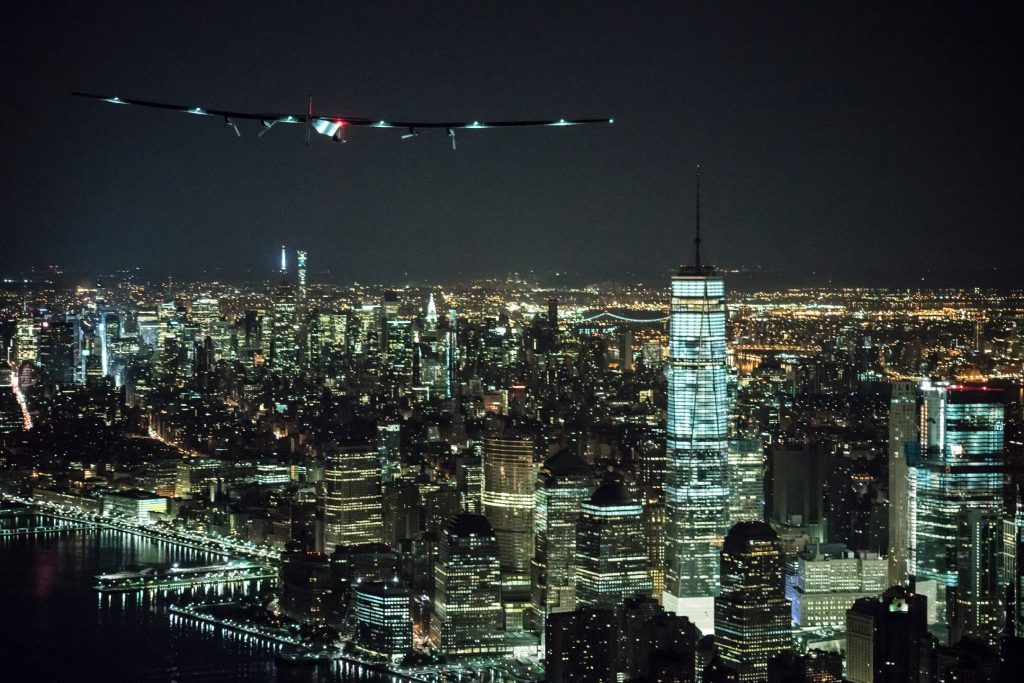 Samedi 11 juin, 1h30 du matin, du bout du « Pier A » sur les quais sud de Manhattan, nous apercevons une fine silhouette illuminée parmi les étoiles. Le contraste de l’éclat de la Statue de la Liberté éclairée et le noir profond du ciel newyorkais pose le décor d’un moment unique. L’avion solaire Solar Impulse, piloté par André Borschberg, vient d’entrer dans la baie de New York par la porte sud, au-dessus du Verrazano Bridge. Il s’approche lentement de l’île de Manhattan et s’apprête à aller danser avec la Statue de la Liberté avant de passer les quartiers de Brooklyn et de Queens et de se poser à l’aéroport Kennedy. Un hélicoptère qui transporte le photographe de l’équipe le suit à la trace pour immortaliser l’instant. Ce dernier n’a pas le droit à l’erreur. Cela fait des mois que l’équipe négocie et prépare cette séance photo hors du commun. Le spectacle ne déçoit pas. Tout se déroule comme initialement prévu et finement orchestré par le bras droit d’André et Bertrand, Gregory Blatt. La centaine de personnes qui attendait sagement sur le tarmac de l’aéroport acclame les deux héros, qui saluent fièrement la foule. C’est une opération réussie pour l’équipe Solar Impulse.