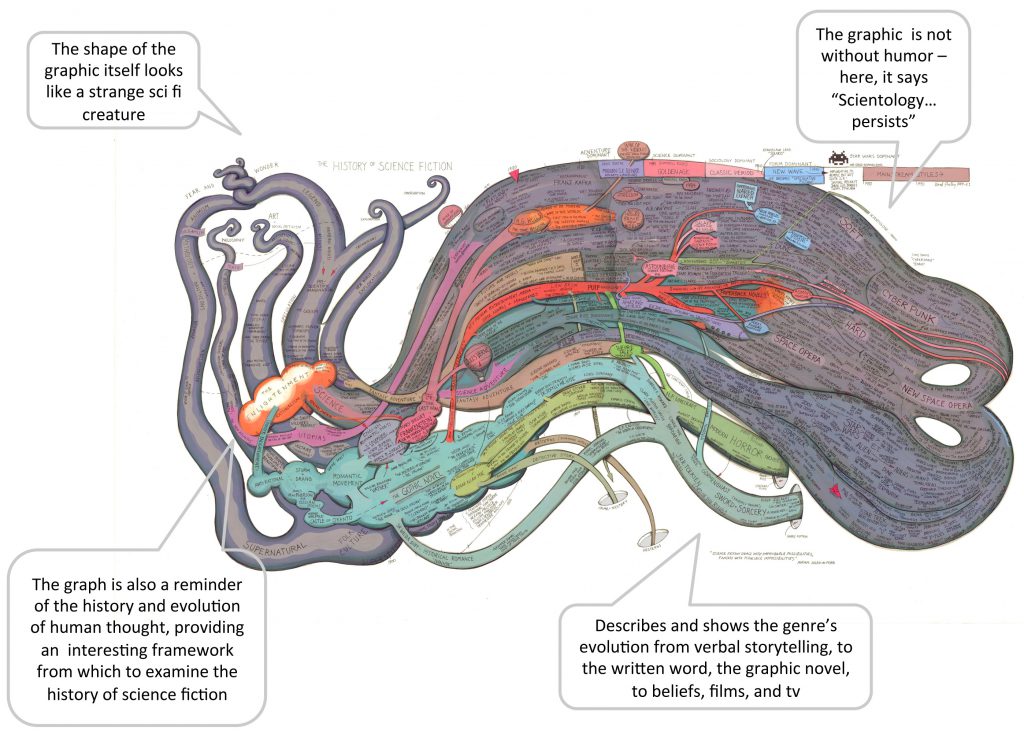 Ceci étant accepté, comment peut-on comprendre l'Art de la science-fiction ("SF Art") ? Eh bien, un peu comme ça: le monde dans lequel nous vivons est constitué de mots et d'images qui, pour une partie d'entre eux, proviennent des sciences ("l'homme est pris dans un processus évolutif" par exemple) et des technologies ("nous avons tous un ordinateur", etc.). En ce sens, un artiste "SF" est un "écrivain" qui puise dans les mots déjà existants pour créer une langue singulière qui, tout comme son collègue littéraire, dit ce qui est, mais différemment que ses prédécesseurs : il nous permet de parler de notre vie, de notre condition humaine, de notre rapport aux sciences et aux technologies alors même que ces dernières façonnent nos vies. En ce sens, le "SF Art" nous offre une langue pour raconter notre vie de tous les jours et nos relations aux artefacts qui nous entourent : le mouvement "cyberpunk" représente notre dépendance aux technologies et le mouvement "steampunk", la tendance postmoderne à réinvestir nos imaginaires passés et à construire notre réalité sur ces mêmes imaginaires.