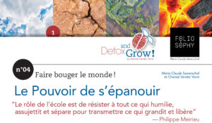 MCS : En effet, la prise de conscience des mécanisme mentaux est la clé du pouvoir juste et de l’épanouissement. Elisabeth et Luc, que nous avons cités dans notre entretien, en témoignent dans leurs textes reproduits ci-dessous : ils sont de très bons enseignants, non parce qu’ils sont bons une fois pour toutes mais parce qu’ils savent interroger leurs pratiques et leurs effets en permanence et en conscience.