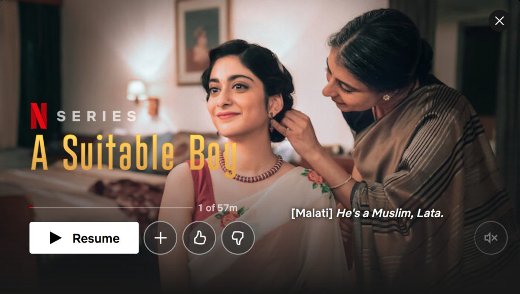En parcourant Netflix à la recherche d’évasion, je suis tombée sur une série dont le titre “A Suitable Boy” m’a tout de suite interpelée. A Suitable Boy, Un garçon convenable en français, est un roman écrit en 1993 par l’auteur indien Vikram Seth. Un best-seller de 1212 pages dans sa traduction française, qui met en scène les destins croisés de quatre familles (les Khans, les Chatterjis, les Mehras et les Kapoors) dans l’Inde des années 50, juste après l’Indépendance.