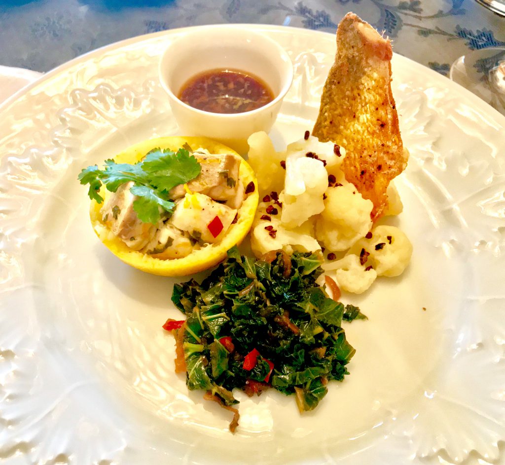 Les fêtes de fin d’année peuvent également se conjuguer avec des recettes simples, gouteuses et peu caloriques. Pour l’occasion je vous propose de cuisiner du filet de bar de ligne, un poisson de mer à chair tendre qui se prête bien à la cuisson vapeur. L’omble chevalier (poisson du lac Léman) aurait eu une couleur plus locale mais sa pêche est fermée du 15 octobre au 15 janvier. L’orange est un fruit versatile qui se cuisine également en salé. La variété ici utilisée et une orange rayée. Sa particularité réside dans sa couleur striée de vert et jaune. Un fruit très esthétique est plutôt rare en culture. Son goût est son parfum sont similaires à l’orange traditionnelle.