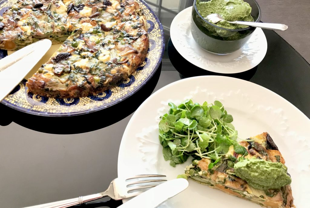 Une fois la frittata cuite et bien dorée, sortez-la du four et dressez-la sur un plat. Vous pouvez la manger chaude, tiède ou froide. Pour ma part je préfère quand c’est encore tiède. Accompagnez votre tranche de frittata d’une salade de pourpier avec une simple vinaigrette en utilisant l’autre moitié du citron restant, une lichette d’huile, sel-poivre et une belle quenelle de pesto.