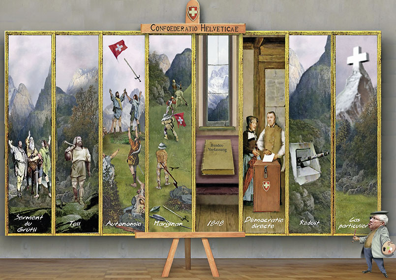 Le romantisme de la fin du XVIIe siècle parachèvera le tableau idyllique d’une Suisse heureuse à l’abri de montagnes et collines, en phase avec elle-même dans un retour complet à la Mère nature. Contre la raison qui étend ses filets sur les villes vouées au commerce ou au luxe, la montagne magnifiée régit une pureté idéalisée que la « modernité » du moment s’acharne à déchiqueter. La vraie Suisse, même devenue une plaque tournante de l’Europe d’alors, n’existera réellement que dans la conscience de sa dette éternelle envers son foyer matriciel : une Suisse sentrale où s’épanouit la Landsgemeinde, seul modèle visible d’une démocratie où s’entremêleraient cette égalité et cette liberté que la Révolution française ne tardera pas à hisser su ses étendards sanglants…