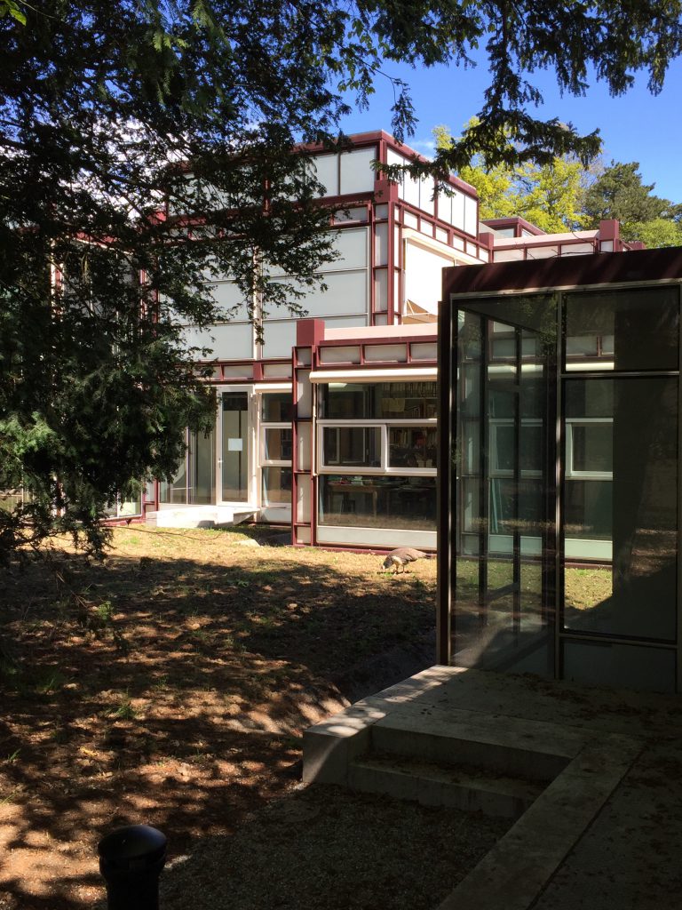 Ecrin métallique. A ce titre, l’ouvrage bénéficie d’un subtil dosage entre l’expression forte de la structure, matérialisée par des colonnes et des poutres « creuses », et la présence d’une façade abstraite et rythmée, entièrement composée en verre. Le métal y est omniprésent. Ce choix permet de mettre en forme « l’épaisseur » de ces éléments porteurs dans les trois dimensions. Son caractère modulaire très abouti ne verse cependant pas dans la métaphore de la machine ou de l’imitation du monde de l’industrie, comme ont pu le postuler à une certaine époque des théoriciens comme Le Corbusier. Ici une préciosité dans le dessin des pièces en acier confère à l’objet un sens qui le place en juste adéquation avec sa fonction : un réceptacle pour des livres anciens consacrés à la science botanique. Avec le recul que confère l’inexorable temps qui passe, on pourrait y voir une réponse architecturale poétique, où la fragilité des feuilles – des arbres ou de papier – se voit entourée par l’élégance des profilés métalliques laissant se diffuser de manière douce la lumière naturelle, elle aussi issue de la même source solaire qui chlorophyllise la création du monde végétal.