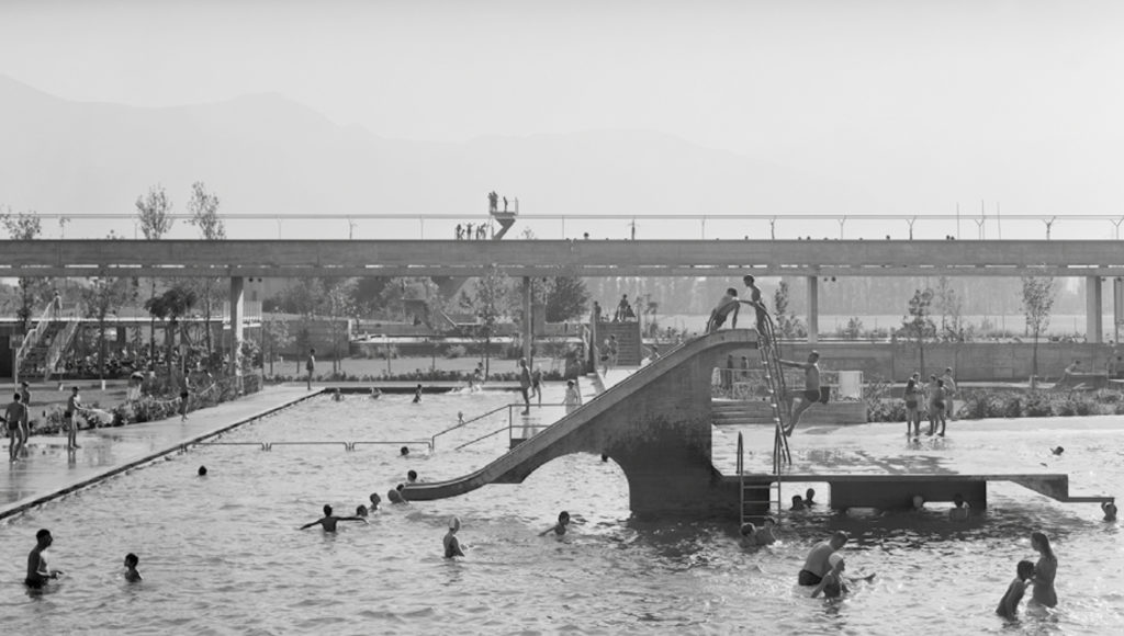 Ce qui impressionne toujours dans cette première architecture du territoire en Suisse, une année après la parution de l’essentiel ouvrage de référence de Vittorio Gregotti « Le territoire de l’architecture » (1966), c’est la pertinence du concept qui allie le plan et la coupe en trois fonctions inséparables : premièrement relier la ville au fleuve par la grande passerelle piétonne, deuxièmement abriter les vestiaires par la couverture du tablier de l’ouvrage d’art et troisièmement présider aux descentes vers les bassins par un système d’escalier et de rampes dont les formes sculpturales s’inscrivent en écho à celles des plongeoirs. D’un point de vue urbain, on constate encore aujourd’hui la justesse et la précision des points de départ et d’arrivée de ce long parcours quasi initiatique au-dessus de la plaine.