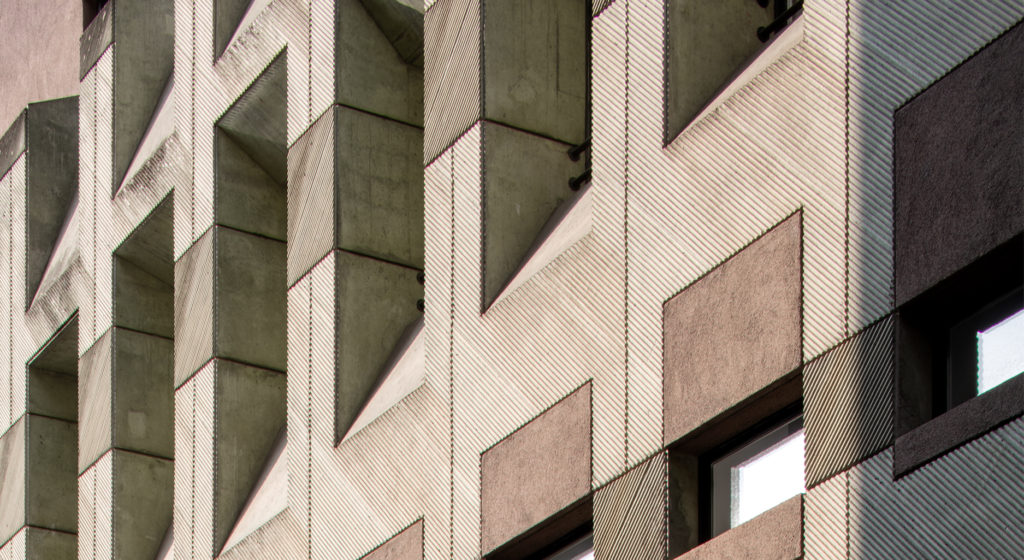 Accueilli par la critique comme étant « l’un des premiers exemples genevois d’architecture ’contextualisée’ » (1), le bâtiment affiche dans son socle une expression qui rend hommage à la notion de modénature, ici inscrite dans une matière coulée, celle d’un béton texturé et teinté. La réinterprétation du mur lourd et de la meurtrière, comme ouverture verticale étroite dans la masse, devient le support à une composition de façade très abstraite dans son graphisme, et très concrète dans l’assemblage des pièces réalisées en atelier de préfabrication. Le dessin de la façade du socle est inspirant en jouant de la thématique du biais, celui de la rue en pente, celui des stries dans le béton ou des tablettes de fenêtres en diagonale. La mixité des traitements de surface de béton, voire de pierre naturelle, est une des premières expériences locales de sortir de l’image de cette préfabrication considérée jusqu’alors comme étant juste un moyen efficace pour répondre à la demande croissante de logements ou d’édifices scolaires.