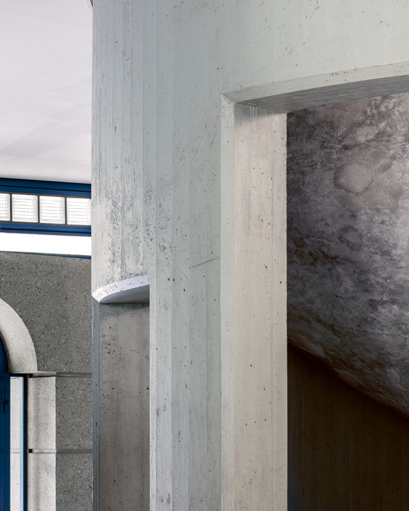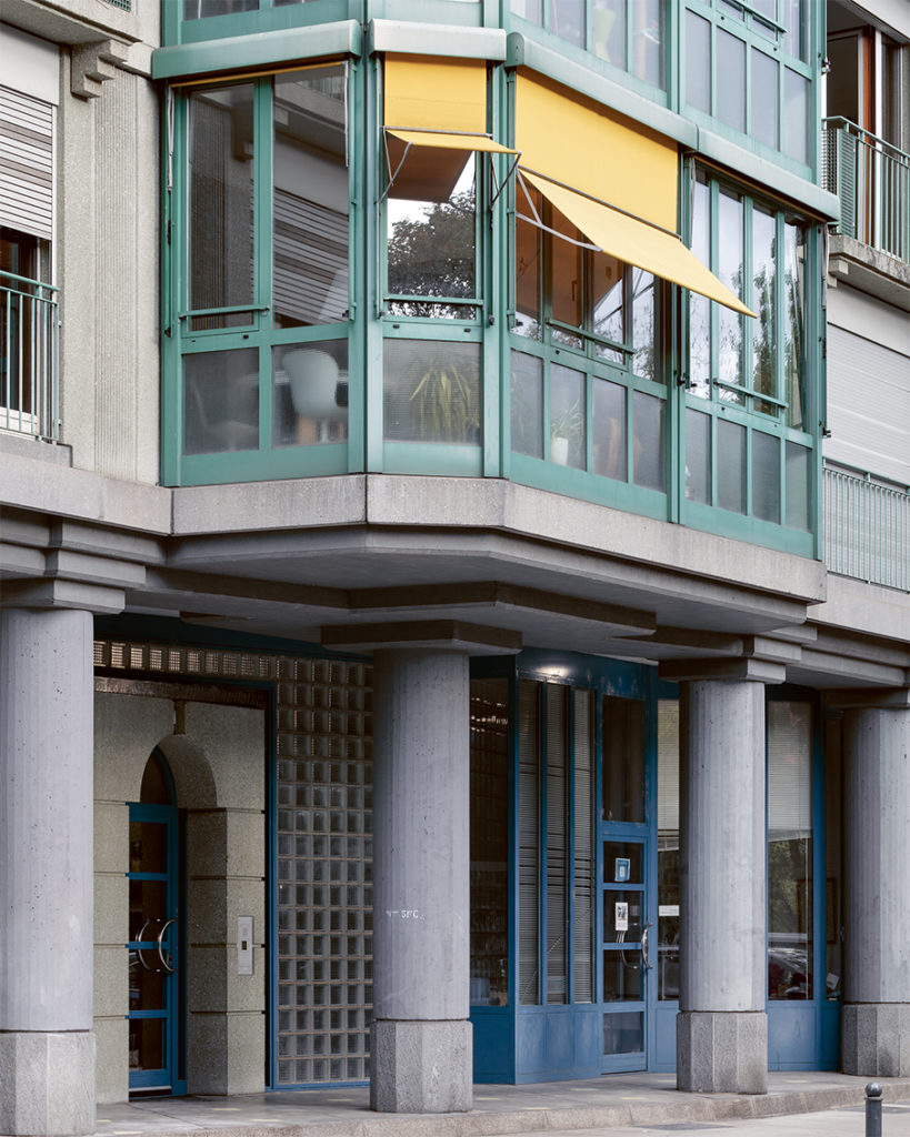 Parmi les autres caractéristiques du bâtiment qui le situent très clairement dans cette période, on retiendra la présence d’un socle au bossage recréé par la préfabrication, des pavés de verre dans la façade d’accès, une cage d’escalier de dessin circulaire – avec puits de lumière conique en verre qui renvoie au modèle classique du 19ème siècle – et une toiture en pente recouverte d’un revêtement en cuivre, en lieu et place de la toiture plate chère à la modernité.