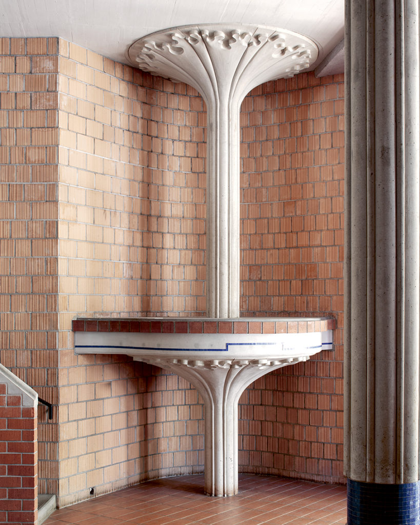 Lors de leur mise en œuvre, les architectes avaient laissé aux ouvriers une certaine marge de manœuvre dans la pose des murs, dans l’assemblage des briques, des carrelages ou de la couleur : une forme de reconnaissance de la qualité de la main de l’artisan, formatrice de la spatialité. Il y a là encore une lointaine référence à l’artiste Gaudi quand il faisait construire les bancs du Parc Güell à Barcelone (1900-1914) à partir d’éclats de céramiques ré-assemblés par les constructeurs dans des formes organiques et animalières que l’auteur avait imaginées.