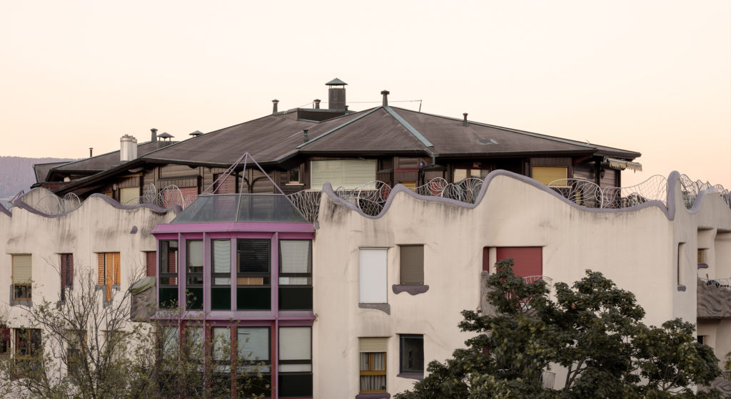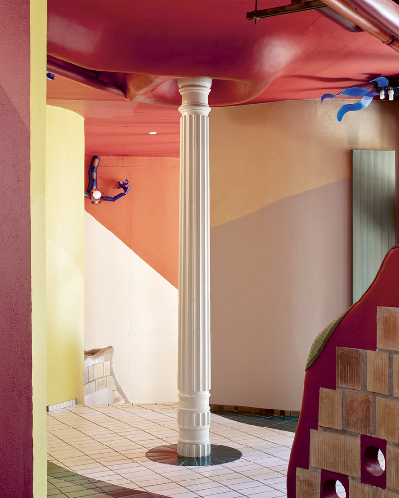 Cette architecture organique, avec sa composante que l’on pourrait qualifier de populiste, parce qu’elle s’adresse presque sans codes complexes à tout un chacun, met en valeur une volumétrie dans laquelle l’angle droit disparaît. Ici, murs courbes en crépi, bow-window en métal coloré, poteaux en forme de spirales ou de champignons, fenêtres de formes diverses et variées, étage d’attique entièrement en charpente en bois sont les ingrédients du concept. Il s’agit d’une composition à la fois hors du temps, mais en fait bien ancrée dans son époque, celle qui rejeta le rationalisme vu comme une forme de diktat intellectuel. Cette pensée forte a fait dire à Robert Venturi, un des grands théoriciens du mouvement postmoderne : « Les architectes n’ont aucune raison de se laisser plus longtemps intimider par la morale et le langage puritain de l’architecture moderne orthodoxe » (2).
