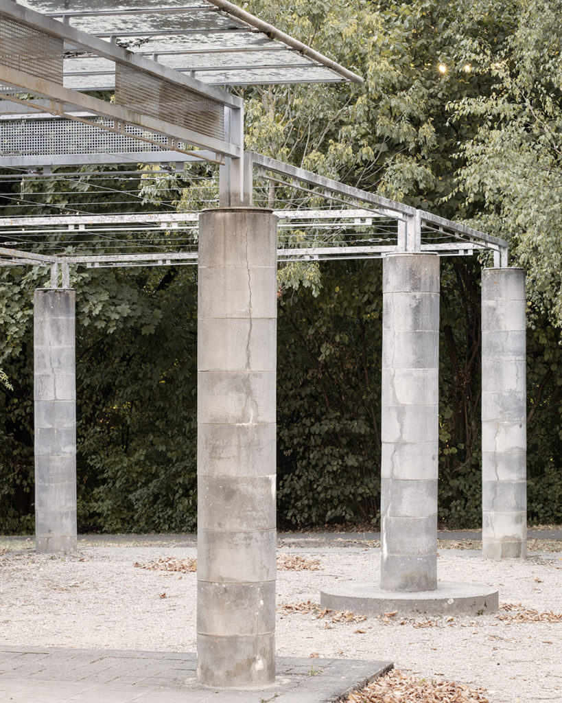 Le parc En-Sauvy se nourrit de ce passé académique et introduit à Genève une approche synthétique qui fait un pont théorique entre le territoire et le paysage. Projet précurseur dans la région, il s’appuie sur d’autres influences comme celle du livre Vittorio Gregotti « ll territorio dell’architettura » (4) ou celle du pavillon de sculpture d’Aldo van Eyck dans le parc Sonsbeek près d’Arnhem aux Pays-Bas (1966) (5). Du premier il se souvient que le site au sens foncier du terme doit être intellectuellement dépassé pour s’inscrire dans un champ beaucoup plus large. Du deuxième, il retient l’utilisation de la brique de ciment avec un regard plus nordique que celle qu’en fit par exemple Mario Botta, tout en composant cette matière par l’ajout d’éléments en métal galvanisé.