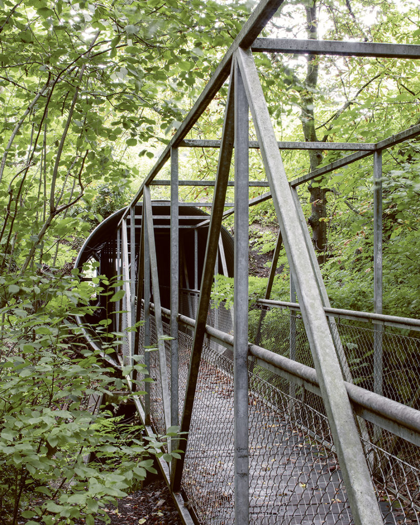 Elément emblématique de la composition du parc, le concept de la passerelle qui se glisse sous l’avenue du Curé-Baud oscille entre l’intuition géniale et la réflexion théorique : l’idée sous-jacente étant de trouver la manière de faire passer l’eau sous la route et le piéton sur la rivière. Cette dernière est canalisée dans un tunnel, cylindre parfait en tôle ondulée. A l’intérieur de ce « tube » très abstrait, l’usager enjambe la rivière par un pont, dont l’ancrage va chercher ses appuis plus loin que le passage souterrain, à l’image des projets territoriaux de Gregotti. Ce « geste » territorial dépasse la fonction pour devenir un objet urbain et paysager : un ouvrage d’art conférant une magnifique synthèse entre des disciplines autrefois cloisonnées, une œuvre pas assez remarquée et mise en évidence à l’époque.