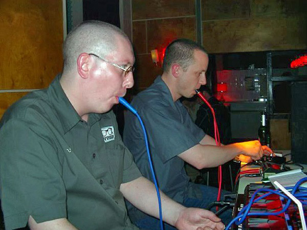 C’était une fin de soirée au début de ce siècle. Une nuit lausannoise en mode «de vin divin l’on devient». Je suis chez un vieil ami, Stéphane Babey – qui est aujourd’hui le rédacteur en chef de Vigousse. Dans son salon: un divan très confortable, une chaîne stéréo et des câbles jack – des 6,35 mm, ceux qu’on utilise par exemple pour brancher une guitare à un ampli. Je ne sais plus lequel de nous deux a eu cette idée, mais c’était celle-ci: «Oh tiens, et si on branchait les câbles à la chaîne et qu’on les mettait dans la bouche?» Résultat: le contact de la salive sur le connecteur en métal crée une interférence électrique, et surtout des bruits et des grésillements tout à fait abominables. Cette nuit-là, on a enregistré une pleine cassette (oui, une cassette) de ces sons. On a appelé cette œuvre magnifique On est trop timides, et on a décidé de former un duo (Les Poissons Autistes) dont l’esthétique consisterait à sucer des jacks et à triturer les bruits subséquents dans des racks et des pédales d’effets – la photo qui illustre ce blog a été prise lors de notre tout premier concert, en juin 2002 au NBI, à Berlin. Bien entendu, on gagne des clopinettes avec cette histoire, on n’a formé aucun courant artistique, mais c’était marrant. «C’était» car, si Les Poissons Autistes existent toujours, nous avons évolué vers des instrumentations un peu (un peu) plus traditionnelles à force de se prendre des décharges sur la langue.