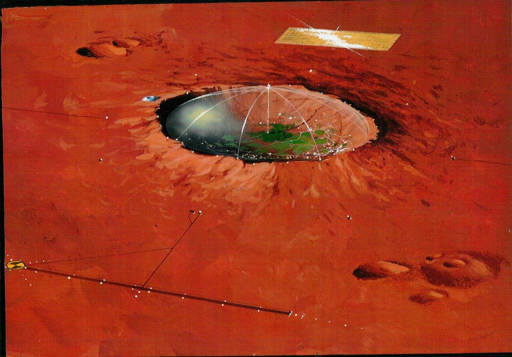 Image à la Une : Illustration de Philippe Bouchet, dit Manchu : Dôme sur Cratère. Il ne s’agit pas là d’un établissement de première, ni même de seconde génération mais, plutôt que d’envisager comme certains, une terraformation globale de la planète Mars, c’est plutôt ce genre de terraformation ponctuelle qui serait envisageable pour l’avenir.