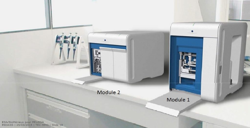 MiDASS (« Microbial Detection in Air System for Space ») est l’exemple de ce que la recherche spatiale MELiSSA peut apporter à la vie sur Terre. L’appareil résulte d’une coopération proposée dans ce cadre par l’ESA à BioMérieux, cette société leader mondial des diagnostiques infectieux in vitro (bactéries, champignons, virus) étant évidemment le meilleur partenaire possible (JV 50/50). L’objet premier de MiDASS est le contrôle des équilibres microbiens dans l’habitat d’un vaisseau spatial mais l’intérêt qu’il présente imposera son usage dans tous les milieux clos habités.