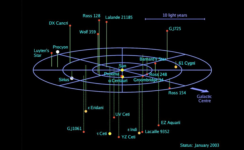 Image à la Une: Nos plus proches voisines, les étoiles se trouvant dans un rayon de 10 années lumière du Soleil (La Voie Lactée a un rayon de quelques 60.000 années lumière). Ce sont les seules que l’on peut aujourd’hui imaginer pouvoir atteindre par un moyen astronautique. Crédit R. Powell.