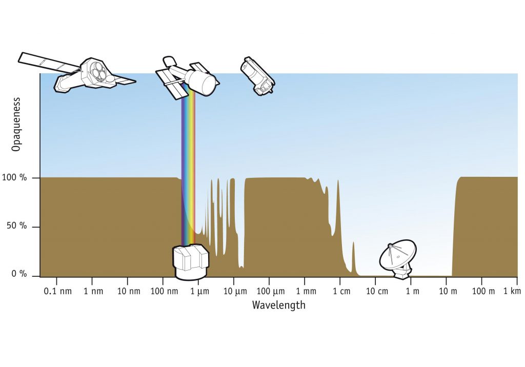 Tout rayonnement est porteur d’informations sur son émetteur que ce soit les rayons gammas, de longueurs d’onde extrêmement courtes, à un bout du spectre, aux ondes radioélectriques très longues, à l’autre bout, et à la lumière visibles, entre les deux. Certains de ces rayonnements sont piégés par le champ magnétique de la Terre dans ce qu’on appelle les Ceintures de Van Allen. Les molécules de l’atmosphère terrestre en bloquent d’autres et finalement nous ne recevons au sol qu’un peu d’ultraviolet (A et B mais pas de C), le rayonnement visible, une grande partie des infrarouges et une partie du rayonnement radio le moins long (voir « image à la Une »). Par ailleurs l’atmosphère, par sa matière même aussi bien que ses mouvements internes, introduit des perturbations (turbulences) dans le cheminement des photons reçues. Ces perturbations ont empêché les progrès dans la capacité de résolution des télescopes optiques, jusqu’à l’invention et la mise en pratique de l’optique adaptative (le prototype “COME-ON”, réalisé sous l’impulsion de l’astrophysicien français Pierre Léna, date de la fin des années 1980 mais la technologie n’a vraiment été utilisée qu’à partir de la fin des années 1990).
