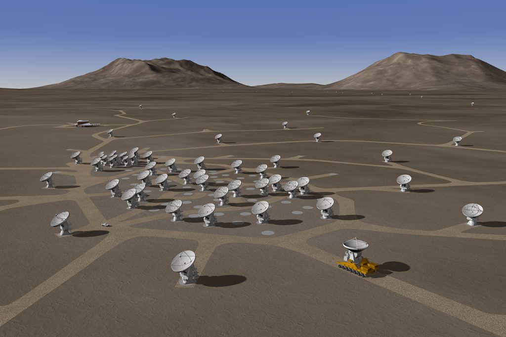 Image à la Une : représentation du système ALMA, crédit ESO ;