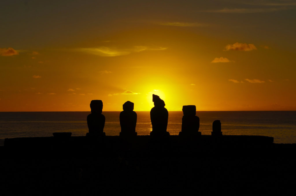 Image de titre : Alignement de moai devant la mer au crépuscule (cliché novo-monde.com)
