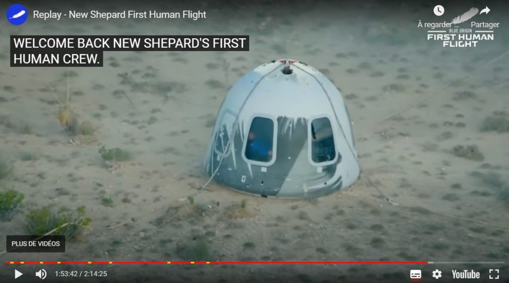 Illustration de titre : capture d’écran de l’atterrissage de New Shepard Crew Capsule.