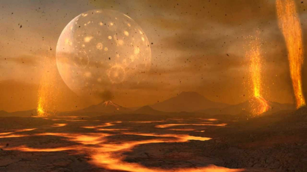 Illustration de titre : Vue-d’artiste de la Lune vue de la surface de la Terre au début de l’éon Hadéen ; crédit Mark Garlick. NB : la Lune apparait très grosse dans le ciel terrestre. C’est une réalité car à cette époque elle n’était pas distante de plus de quelques 50.000 km (30.000 au minimum). Et, comme la Terre elle était encore extrêmement chaude avec un volcanisme et des impacts d’astéroïdes très nombreux, affectant sans cesse une croute de surface très mince (en formation du fait des différences de températures intérieur/extérieur).